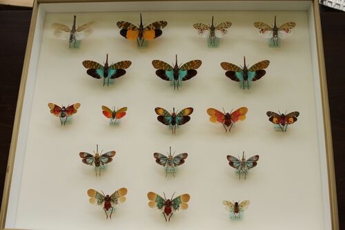 東南アジアのビワハゴロモが仕上がったので、ひと箱作りました。 頭部が伸びて、天狗様の鼻のよう。そして翅がきれい。 青いひと。 鼻先だけ青い。 昔話の鬼がこういうの持ってましたよね。 水玉! この個体だけは南米出身で、違ったグループに属しています…