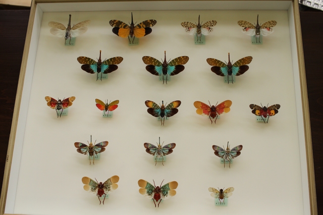 2016-07-10 ビワハゴロモ入荷しました 標本 その他の昆虫 東南アジアのビワハゴロモが仕上がったので、ひと箱作りました。 頭部が伸びて、天狗様の鼻のよう。そして翅がきれい。 青いひと。 鼻先だけ青い。 昔話の鬼がこういうの持ってましたよね。 水玉! この個体だけは南米出身で、違ったグループに属しています。白飛び気味で分かりづらいですが、これは地衣類カラー。渋い! 色も形も素敵なハゴロモたちでした。価格は1500円~2000円です。お財布にもやさしい虫であります。